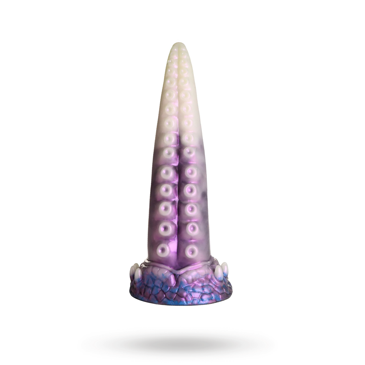 Fantasydildo: Pärlvit, lila och blått skaft med avsmalnande spets och bred kropp.