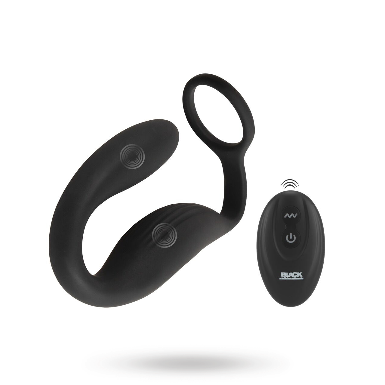 Cock ring with RC butt plug från Black Velvets kombinerar en prostata- och perineumvibrator med en penisring. Den stretchiga ringen sitter tajt runt penis och kan effektivt stödja erektionen. Samtidigt ger den införda vibropluggen med den böjda P-punktsdesign intensiv stimulans i anus. Den mjuka, stimulerande perineumvibratorn sitter tätt mot perineum och ger ytterligare stimulans.